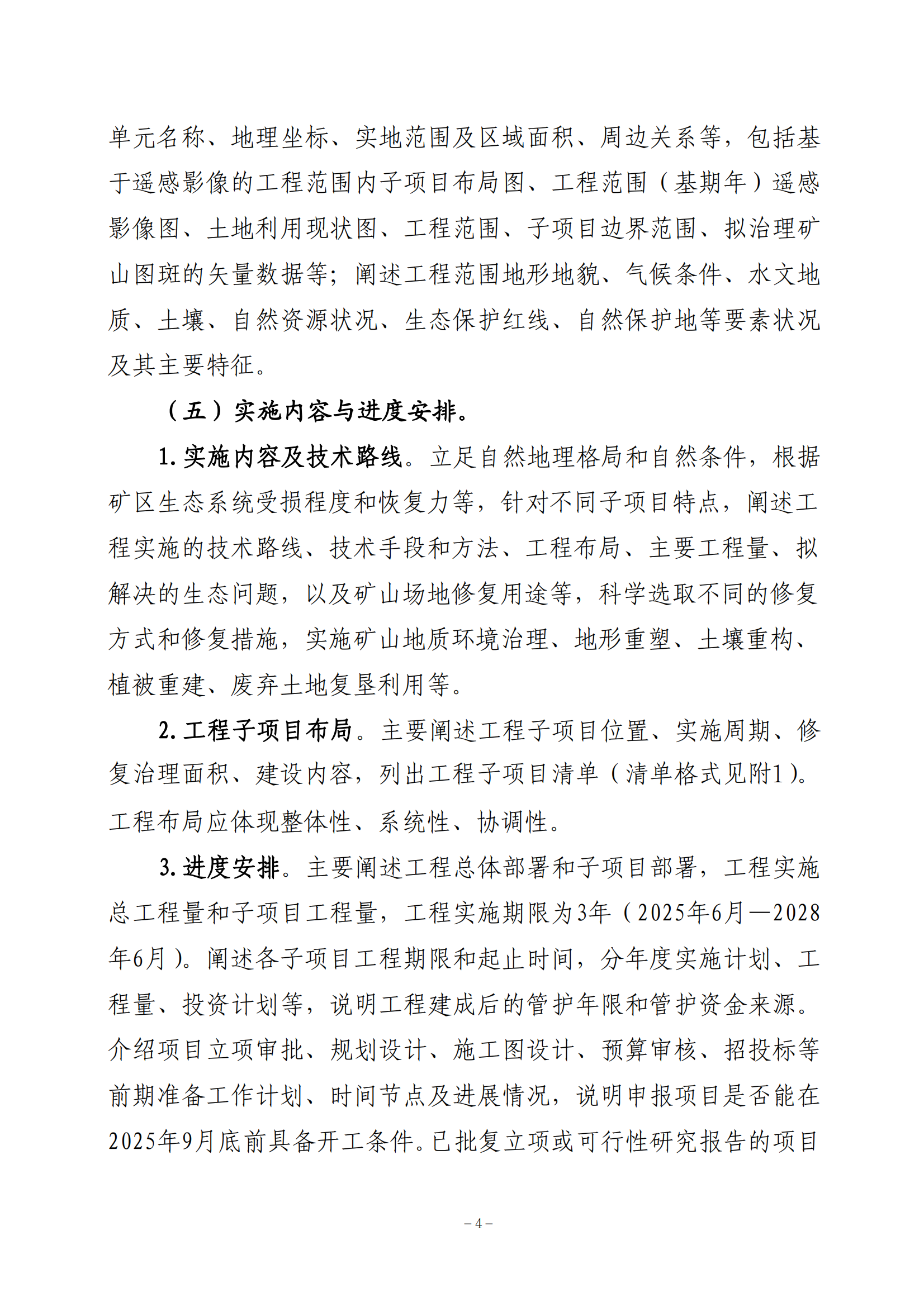 ?。ㄋ模┥陥?bào)文件請(qǐng)于2025年4月30日前,經(jīng)省級(jí)人民政府批準(zhǔn)同意后由省級(jí)財(cái)政、自然資源主管部門聯(lián)合行文報(bào)送財(cái)政部、自然資源部。申報(bào)文件應(yīng)附項(xiàng)目實(shí)施方案(編制大綱見(jiàn)附件)、中央對(duì)地方專項(xiàng)轉(zhuǎn)移支付項(xiàng)目績(jī)效目標(biāo)申報(bào)表、平面規(guī)劃圖、項(xiàng)目區(qū)域內(nèi)歷史遺留廢棄礦山圖斑數(shù)據(jù)等(含全部電子文檔)。申報(bào)材料應(yīng)簡(jiǎn)明扼要、簡(jiǎn)便裝訂,避免繁瑣冗長(zhǎng)、過(guò)度包裝。