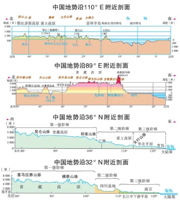 三級(jí)階梯的驚天布局   中國(guó)的地形像一座巨大的階梯,自西向東逐級(jí)下降,形成全球罕見(jiàn)的"三級(jí)階梯"地貌,這直接決定了我國(guó)人口分布、經(jīng)濟(jì)發(fā)展甚至歷史進(jìn)程。