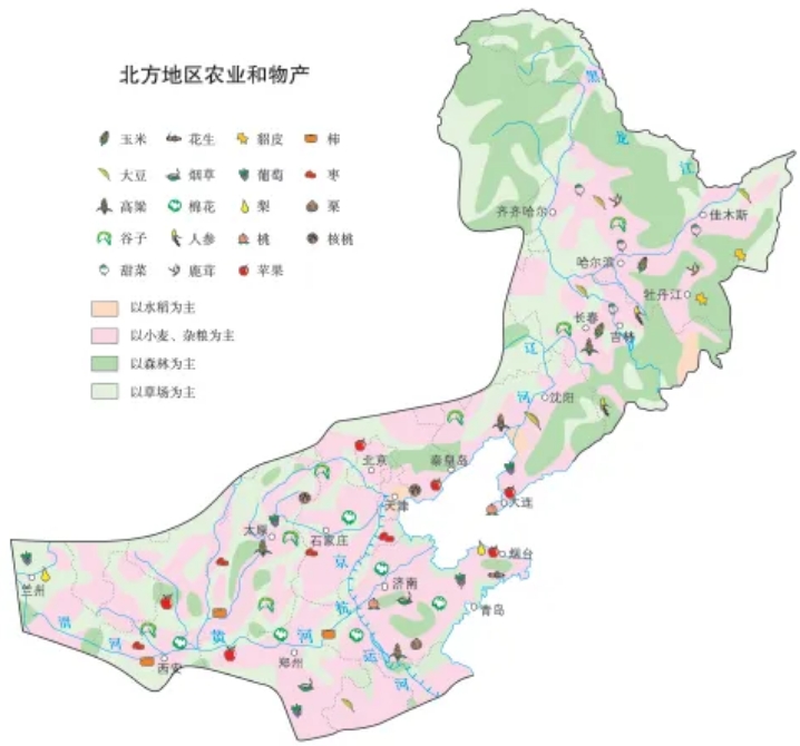 小麥:華北平原("中國(guó)糧倉(cāng)")、新疆(優(yōu)質(zhì)強(qiáng)筋麥)
