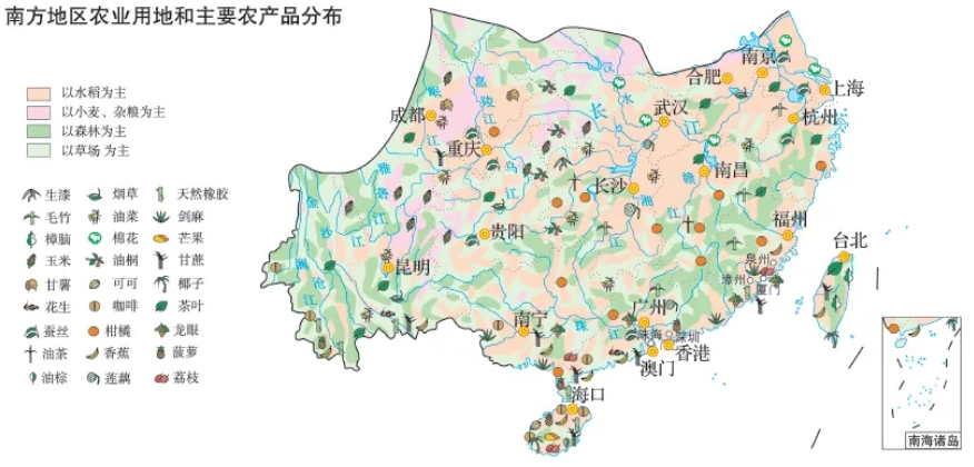 水稻:長(zhǎng)江流域(占全國(guó)65%)、東北新稻區(qū)(五常大米)