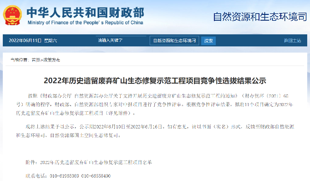 一、2022年歷史遺留廢棄礦山生態(tài)修復(fù)示范工程項(xiàng)目2022年歷史遺留廢棄礦山生態(tài)修復(fù)示范工程項(xiàng)目競爭性選拔結(jié)果公示按照《財(cái)政部辦公廳 自然資源部辦公廳關(guān)于支持開展歷史遺留廢棄礦山生態(tài)修復(fù)示范工程的通知》(財(cái)辦資環(huán)〔2021〕65號(hào))明確的程序,財(cái)政部、自然資源部組織專家對申報(bào)項(xiàng)目進(jìn)行了競爭性評審。根據(jù)競爭性評審結(jié)果...