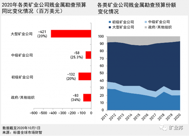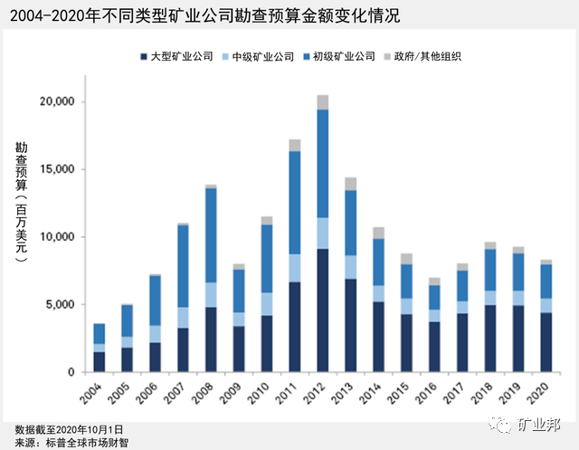 標(biāo)普全球市場財智的最新研究表明,各類礦業(yè)公司的有色金屬勘查預(yù)算都在2020年有所下降。大型礦業(yè)公司仍然占全球勘查預(yù)算的最大份額,其次是初級礦業(yè)公司、中級礦業(yè)公司、政府和其他組織。預(yù)算下降的原因是與疫情相關(guān)的區(qū)域封鎖,迫使許多勘探公司只能進(jìn)行必要的工作。而金屬價格的劇烈震蕩也加劇了勘查預(yù)算的下降,由于對長期復(fù)蘇的擔(dān)憂,勘查預(yù)算減少。