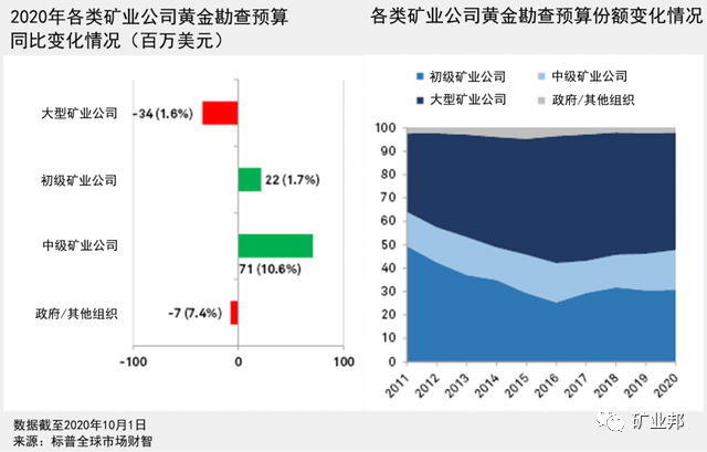漲跌幅方面大型礦業(yè)公司的黃金勘查預(yù)算同比下降1.6%,初級和中級礦業(yè)公司分別增長1.7%和10.6%。
