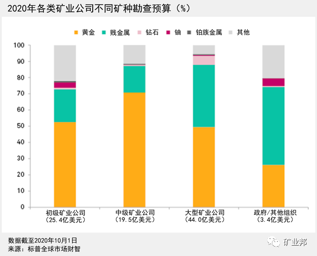 中級礦業(yè)公司的預(yù)算主要集中在澳大利亞,其次是加拿大和墨西哥,預(yù)算重點是貴金屬。中級礦業(yè)公司在澳大利亞的勘查預(yù)算同比下滑14%,而馬達(dá)加斯加則從2019年的100萬美元增加到2300萬美元,成為中級礦業(yè)公司預(yù)算支出增幅最大的國家。幾家屬于中級礦業(yè)公司的中國公司繼續(xù)推動地方預(yù)算,從而使中國保持了中級礦業(yè)公司勘查預(yù)算第四名的位置。中國還主導(dǎo)了政府/其他公司類型勘查預(yù)算,因為中國的許多礦業(yè)公司都是國有企業(yè)。