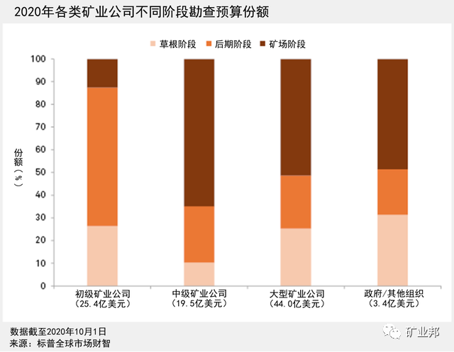 中級礦業(yè)公司增加了后期和礦場階段的預(yù)算,分別同比增長了3%和9%,但這并沒有抵消草根階段勘查預(yù)算下降9100萬美元的額度。