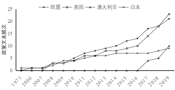 本文對澳大利亞、日本、歐盟和美國2006—2019年出臺的主要關(guān)鍵礦產(chǎn)政策文本進(jìn)行比較分析??傮w來看,澳大利亞政府的相關(guān)政策出臺較晚,2016年之后加快在關(guān)鍵礦產(chǎn)戰(zhàn)略方面的布局,政策數(shù)量開始上升,2019年確定關(guān)鍵礦產(chǎn)清單,主要政策目標(biāo)沒有發(fā)生變化。日本、歐盟、美國3個國家(地區(qū))關(guān)鍵礦產(chǎn)戰(zhàn)略呈現(xiàn)政策數(shù)量增加、政策關(guān)注點系統(tǒng)化、清單定期更新與完善3個特征。