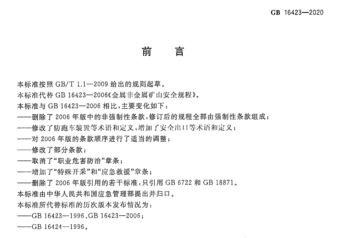 本次修訂總體上沿用了原標(biāo)準(zhǔn)的章節(jié)結(jié)構(gòu),主要集中在井下提升運(yùn)輸、礦井火災(zāi)防治、供配電、通信、飾面石材開采等方面進(jìn)行了修改完善,同時(shí)加入了應(yīng)急救援和閉坑的相關(guān)內(nèi)容,重點(diǎn)修訂內(nèi)容有: