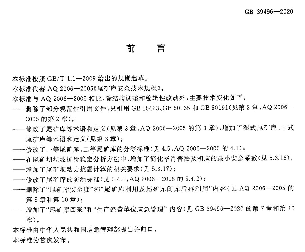 二是明確了《規(guī)程》的適用范圍。新制定的《規(guī)程》進(jìn)一步明確了尾礦庫定義:用以貯存金屬、非金屬礦山進(jìn)行礦石選別后排出尾礦的場所,排除了其他工業(yè)廢渣庫、電廠灰渣庫等。明確適用于中華人民共和國境內(nèi)的尾礦庫在建設(shè)、生產(chǎn)運(yùn)行、閉庫、回采、安全評價(jià)等方面的安全要求,既包括技術(shù)要求,也包括管理要求。