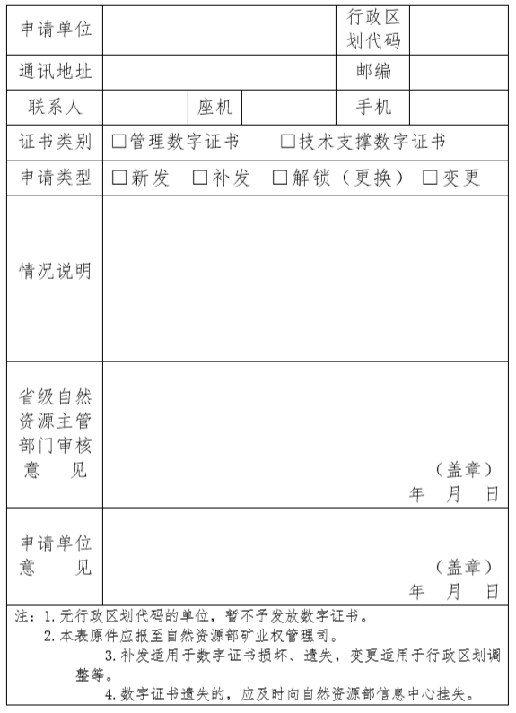 九、數(shù)字證書(shū)應(yīng)嚴(yán)格管理,規(guī)范使用。地方各級(jí)自然資源主管部門(mén)申請(qǐng)新發(fā)、補(bǔ)發(fā)、解鎖(更換)、變更數(shù)字證書(shū)的,需通過(guò)省級(jí)自然資源主管部門(mén)向自然資源部提出書(shū)面申請(qǐng)。其中,數(shù)字證書(shū)遺失的應(yīng)及時(shí)向自然資源部掛失。數(shù)字證書(shū)申請(qǐng)表見(jiàn)附件1。