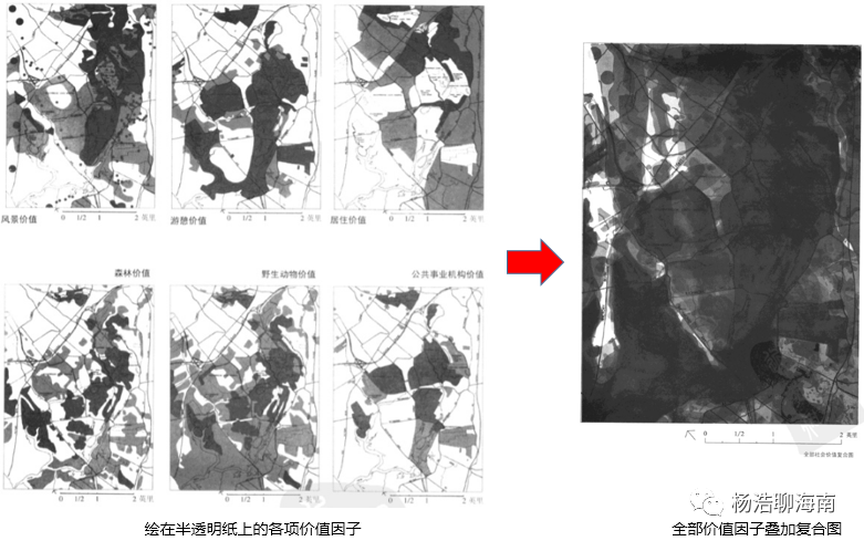 紐約里士滿區(qū)景觀大道選線工程中,麥克哈格對(duì)各類自然價(jià)值、社會(huì)價(jià)值因子分別進(jìn)行評(píng)價(jià),礙于當(dāng)時(shí)的技術(shù)手段,他使用灰階圖像表達(dá)每個(gè)因子的三個(gè)等級(jí),將單項(xiàng)因子的灰階圖像繪制在半透明紙上,將多個(gè)半透明紙疊在一起,就得到了多個(gè)因子疊加之后的“千層餅”,從而求得最終用地適宜性,并進(jìn)而確定效益最大、環(huán)境影響最小的道路路線方案。
