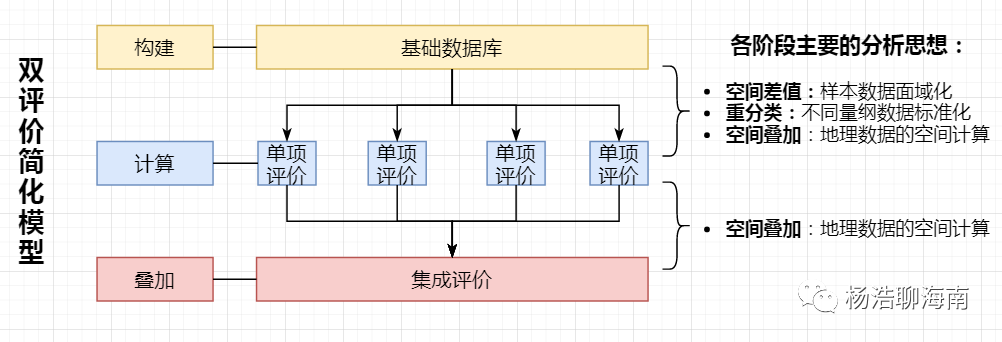 麥克哈格"千層餅"方法的延伸就是今天的GIS中的中的權(quán)重疊加。而在雙評(píng)價(jià)過(guò)程中,單項(xiàng)評(píng)價(jià)階段、集成評(píng)價(jià)階段,都需要使用使用空間疊加方法。此外,雙評(píng)價(jià)過(guò)程中,常用到的量化分析方法還包括:空間插值方法、重分類(歸一化)方法等。