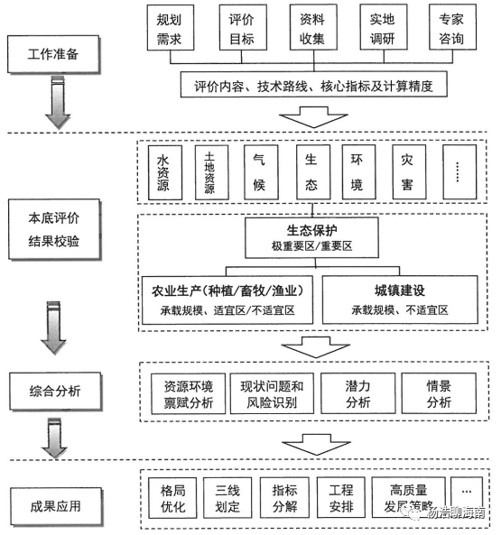 根據(jù)《雙評(píng)價(jià)技術(shù)指南》(2020年一月份版),雙評(píng)價(jià)技術(shù)流程可以分為四大階段:工作準(zhǔn)備、本底評(píng)價(jià)與結(jié)果校驗(yàn),綜合分析、成果應(yīng)用。